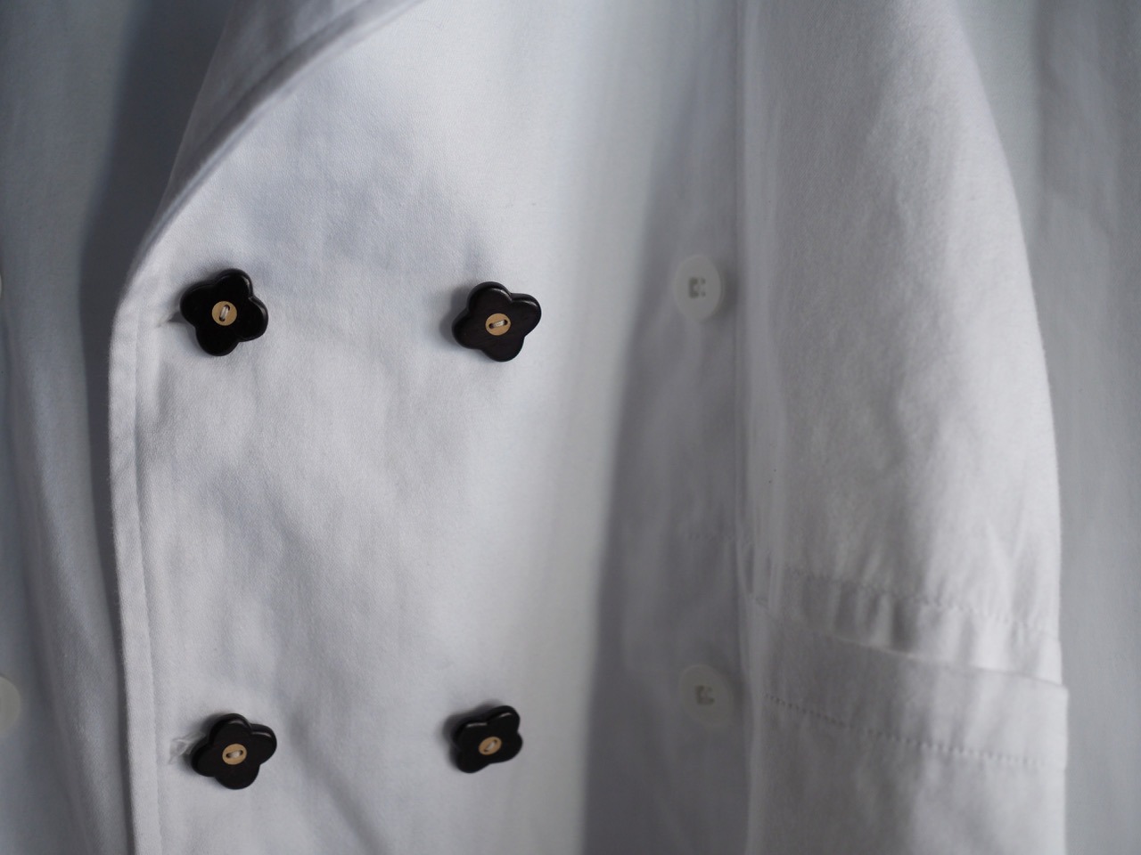 神田さんとのコラボレーションの話が決まり、ベースになる服を探し求めていた時に見つけたのですが、そのデザイン性の高さにものすごく惹かれました。実際にどのようなボタンをつけていただくかは神田さんに丸投げですが、、、、