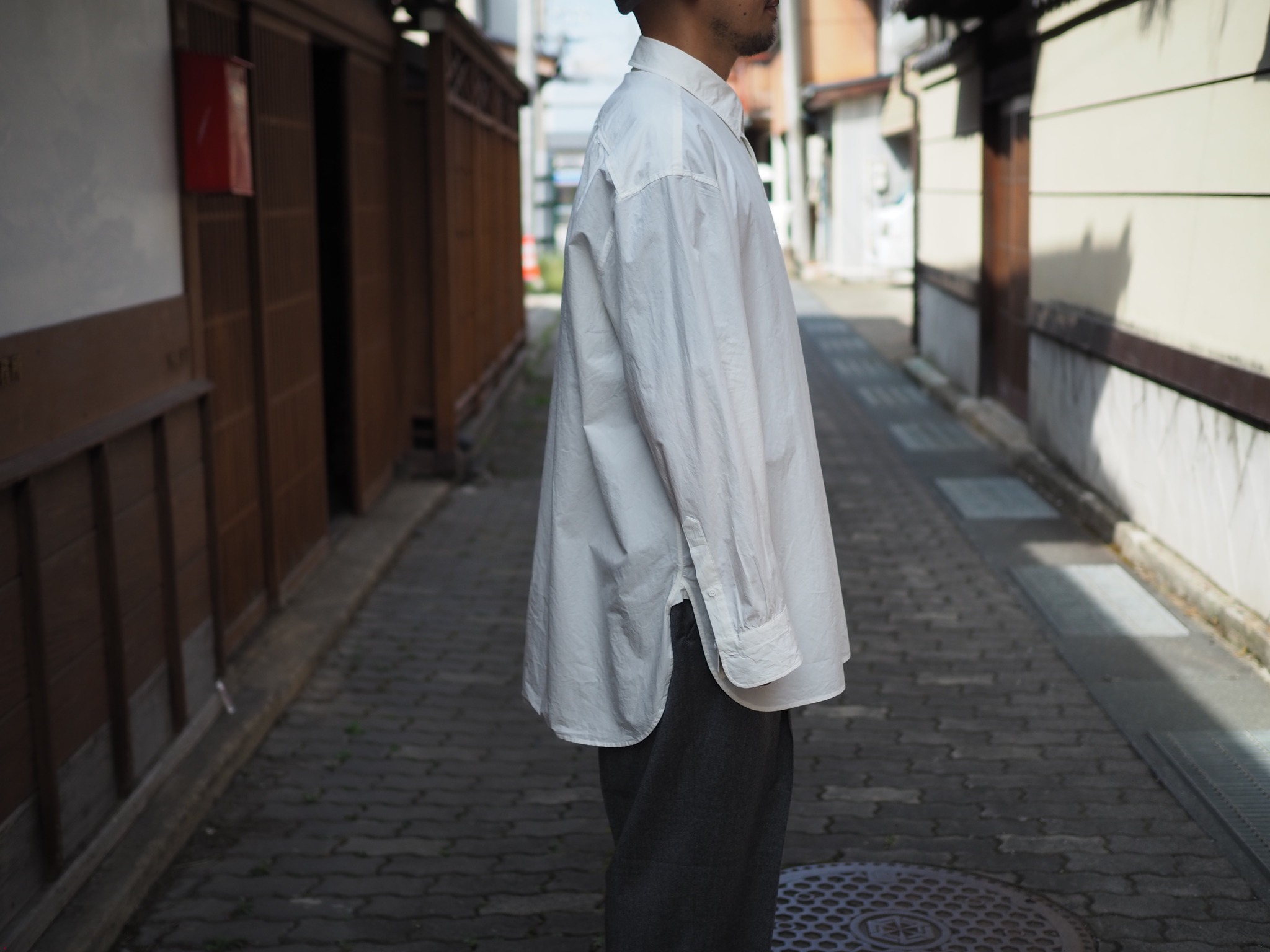 かなり古い時代のシルエットとディテールを落とし込んだシャツは、上品なパターンメイキングで有りながら、長めな着丈など力の抜けたルーズなサイズ感が特徴。