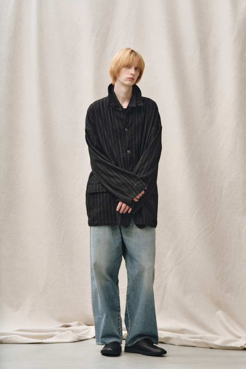 LOOK1、2で見受けられるストライプ生地はリネンとシルクを混紡し旧式の織機を使用して作成したYOKOさんオリジナルの素材です。