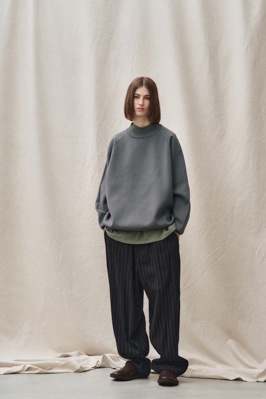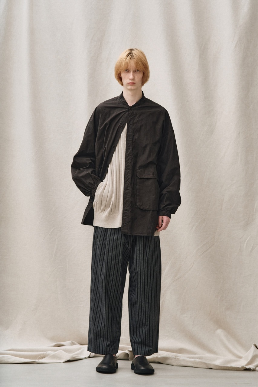 LOOK6はタイプライターコットンを用いて製品染めを施したもの。シンプルなデザインで生地が本当にいい。パリッと音が鳴るような心地よいタッチ感。