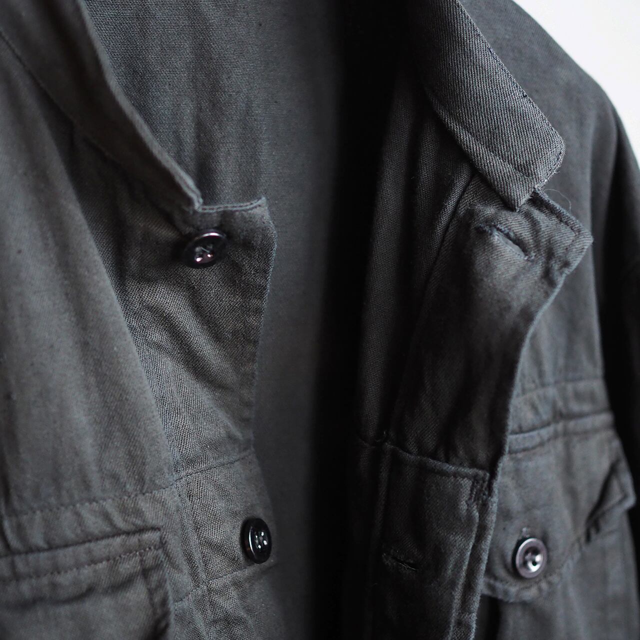 仕上げにブラックで製品染めを施すことで独自の色合いに変化させており、ボタンまで染めています。