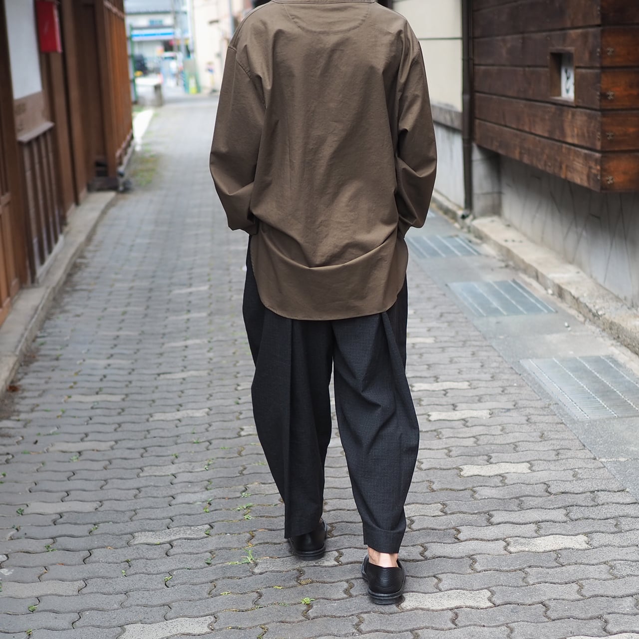 プルオーバーデザインのシャツは着用し難い作品も見受けるが、本作は生地のストレッチが程よく効いおりとても着やすい。