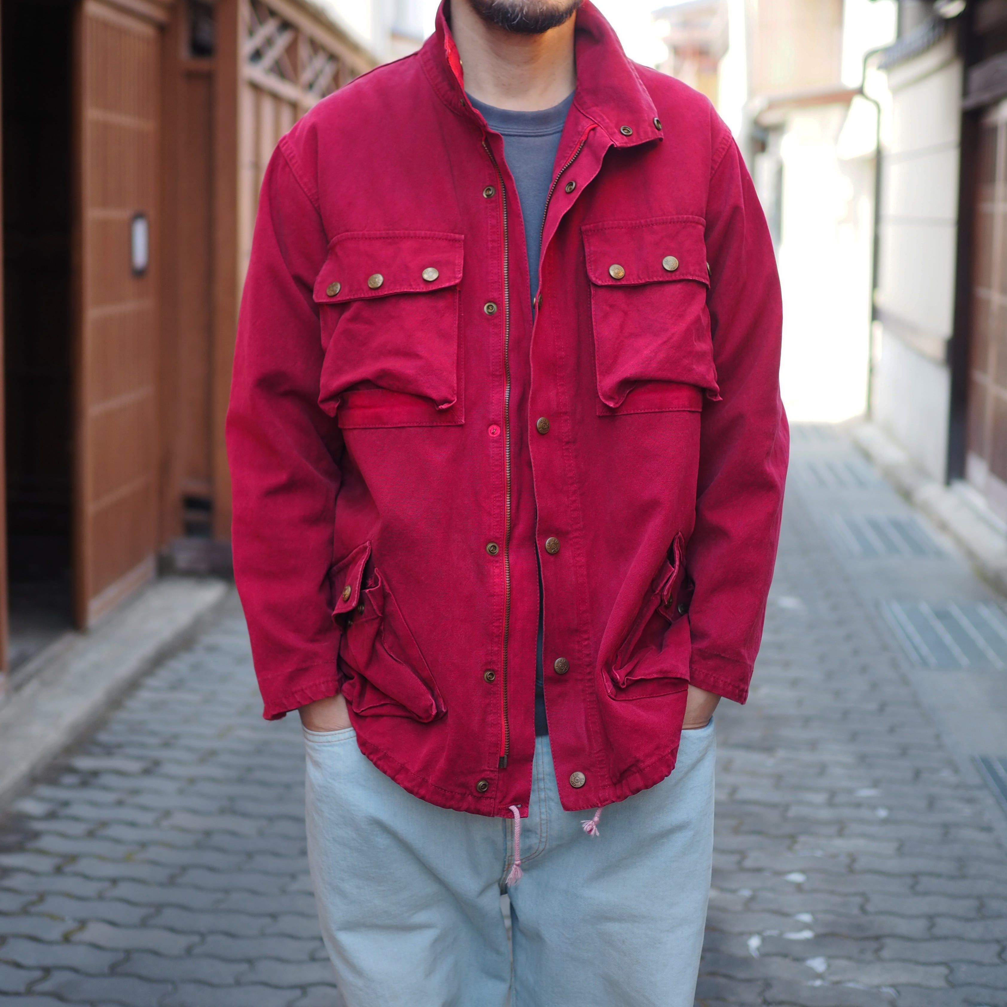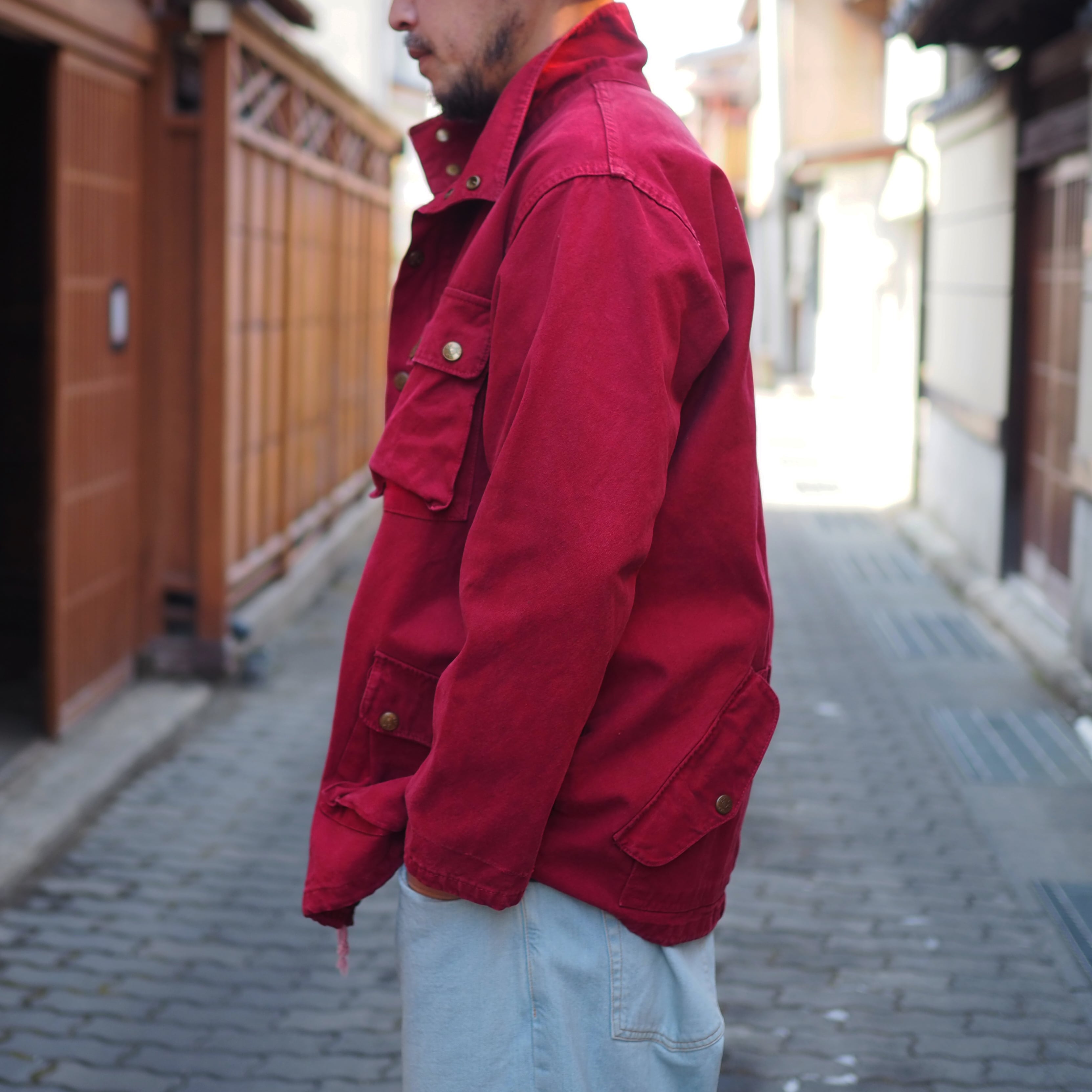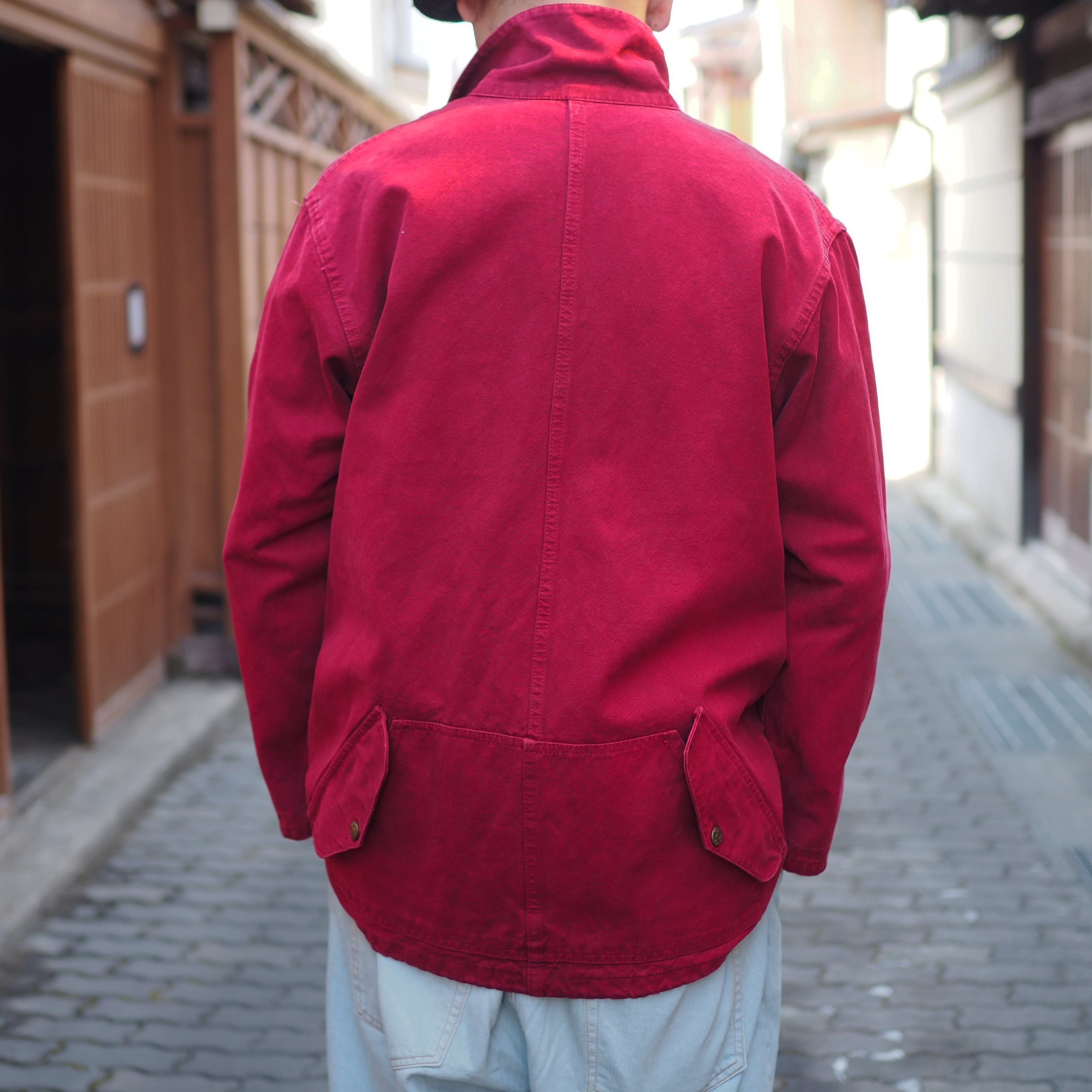 そのようなワークジャケットをあえてディープレッドに染めました。(元はピンク調)