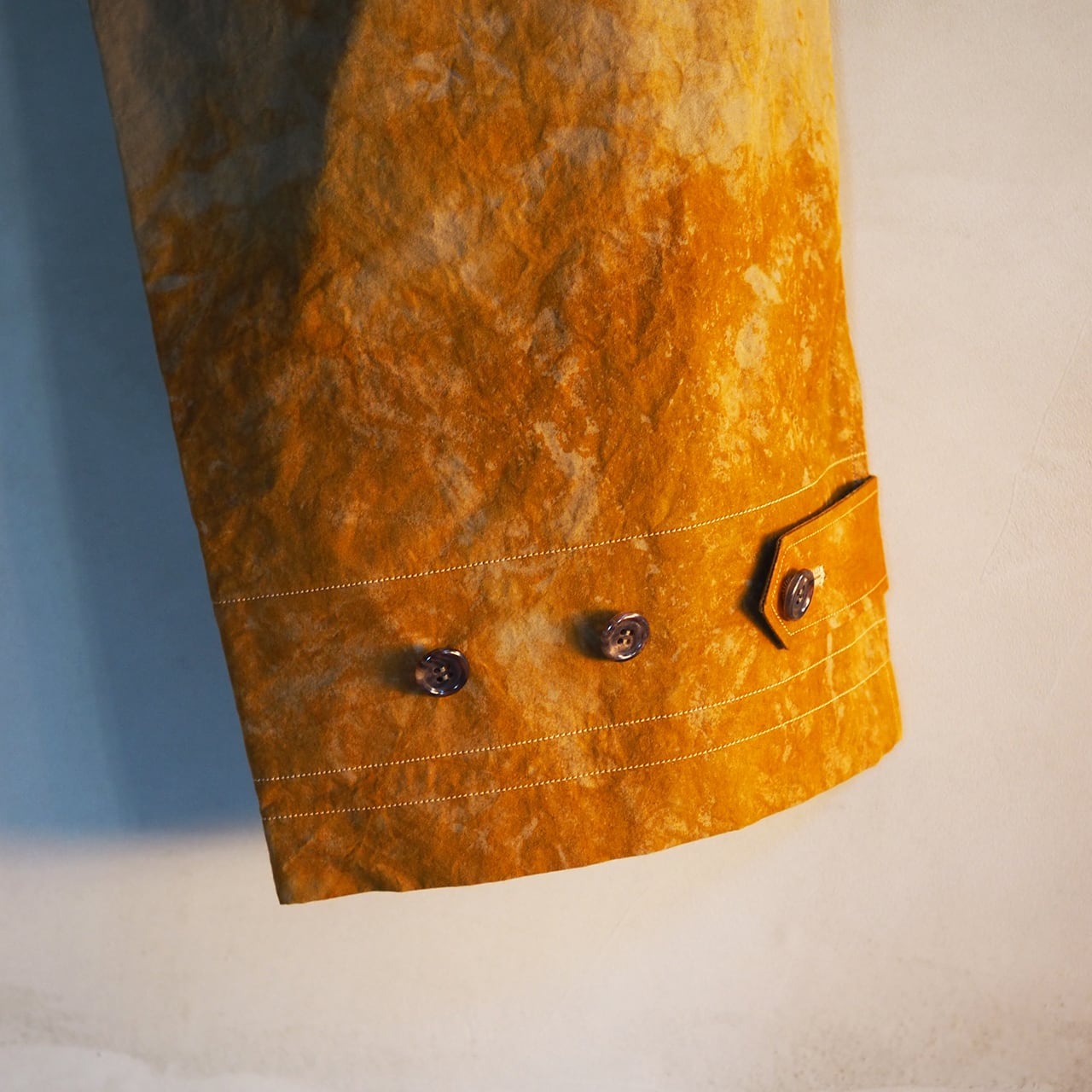 荒い粒子の特徴を生かして、あえて大胆にムラを出すような手法で染め上げ、荒々しく不均等な染まり方が特徴的。