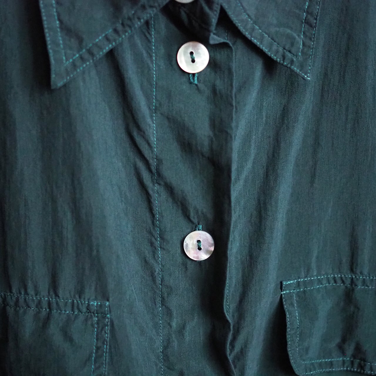 元は鮮やかなグリーンですが、ブラックで製品染めをすることでダークグリーンに変化させています。