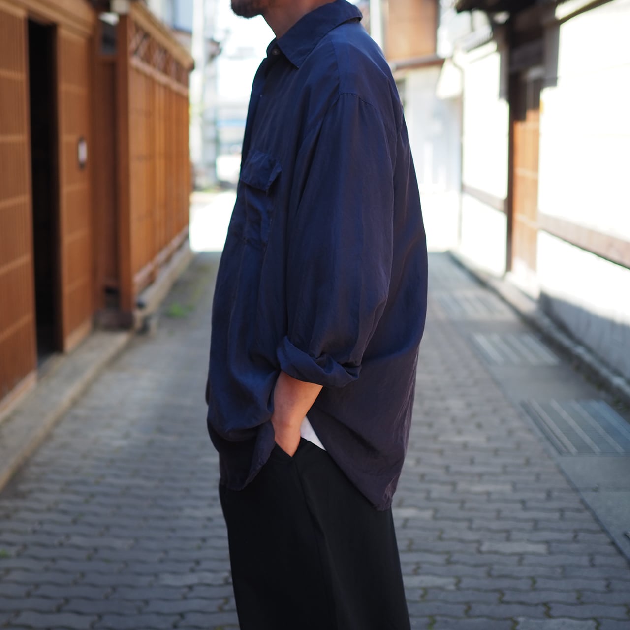 本来は明るいパープルのシャツでしたがブラックで製品染めをする事でディープパープルに変化しています。青みも感じる独自性の強い色合いです。