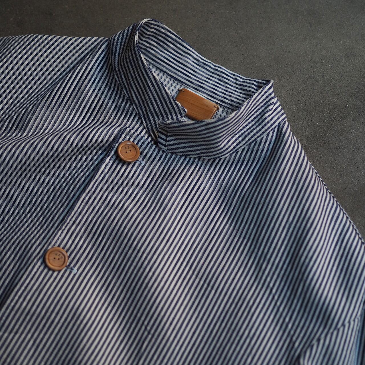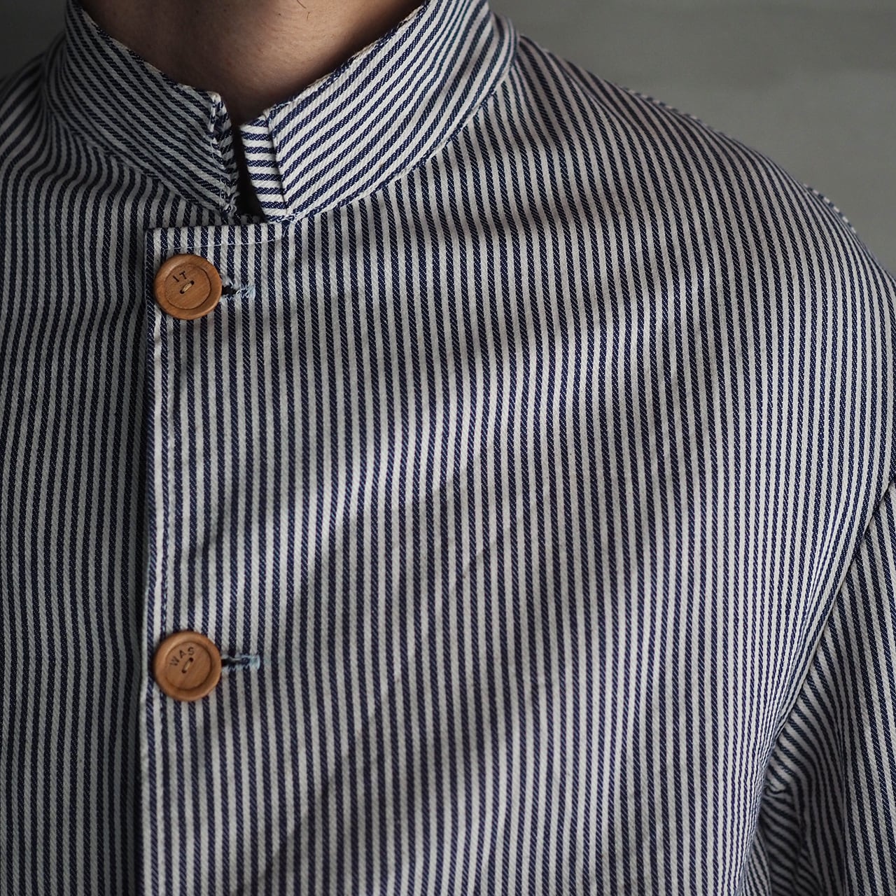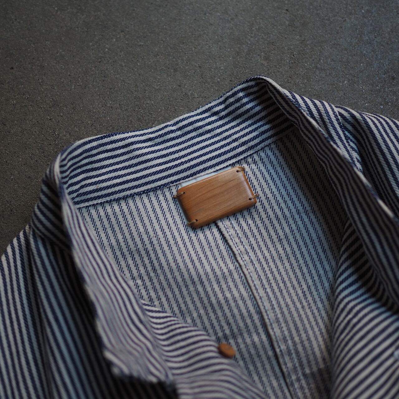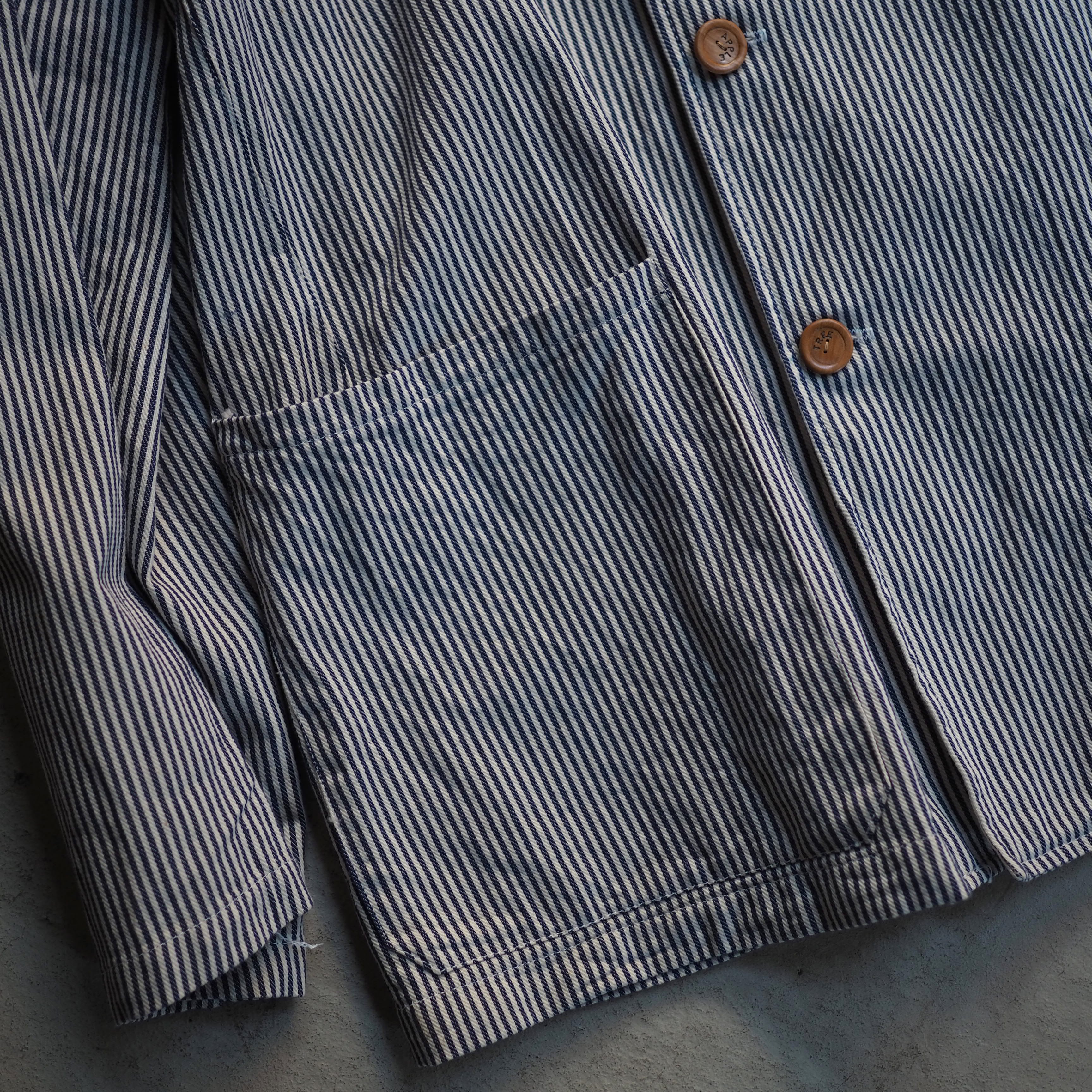ヒッコリーストライプのような見た目でちょっと汚れても絵になるひと品で、例えばペンキがちょっとついててもかっこいい。