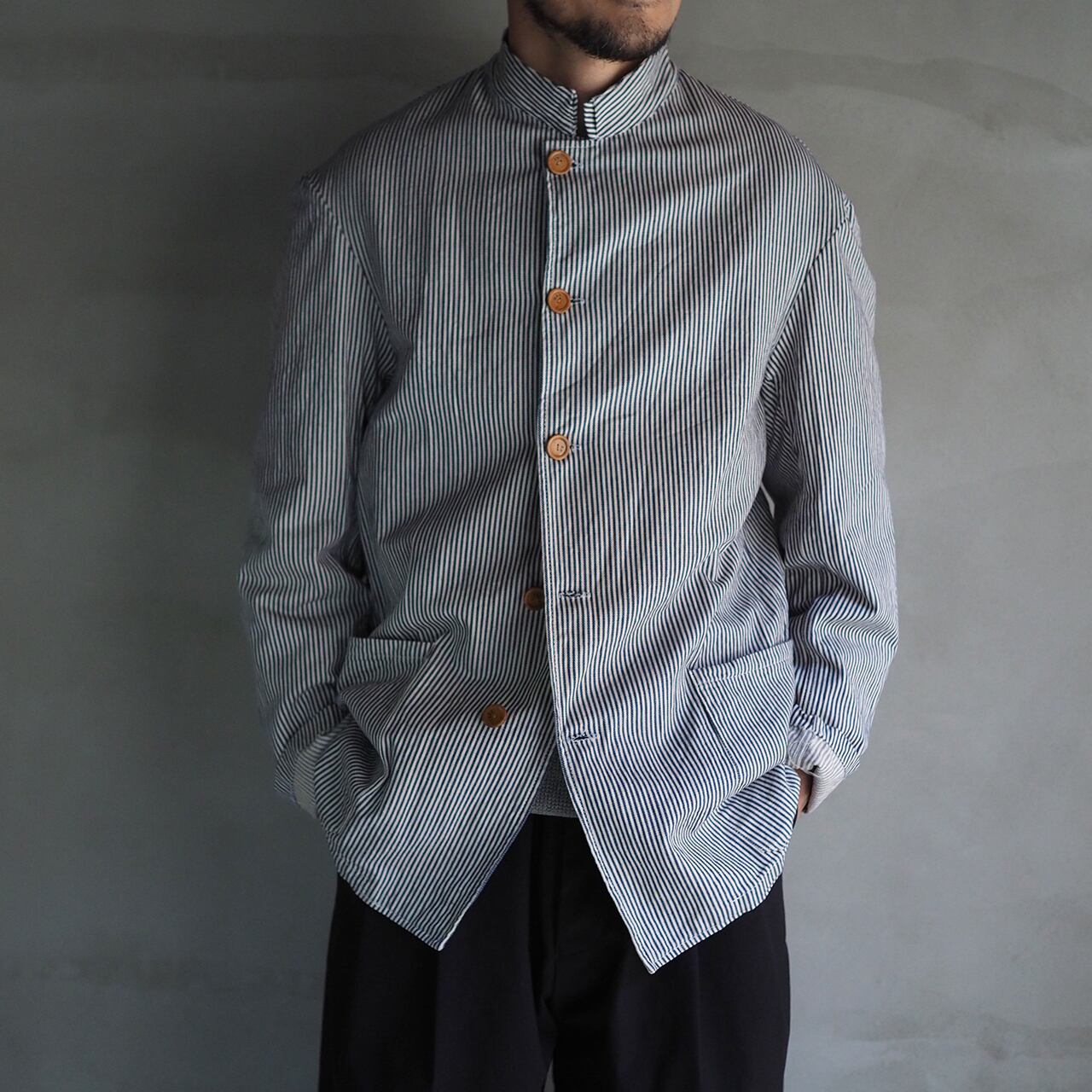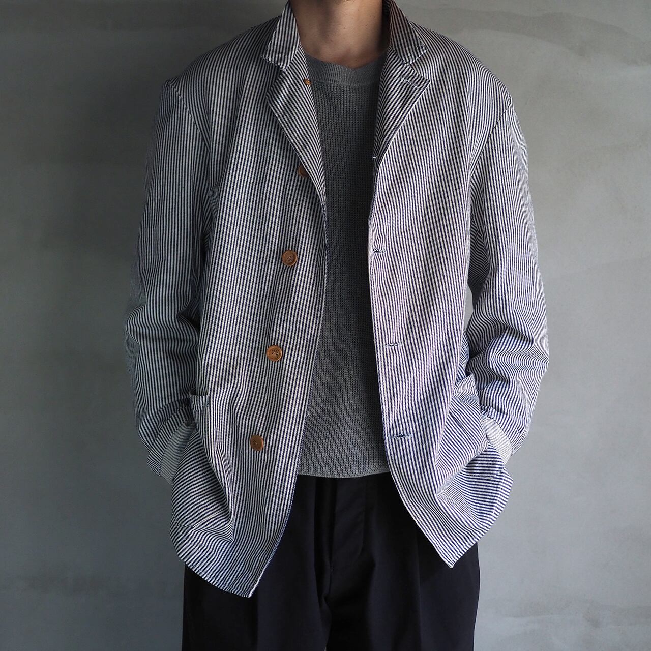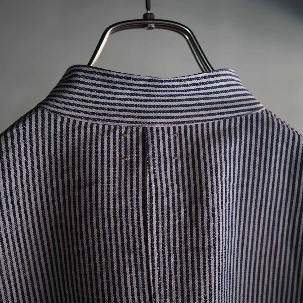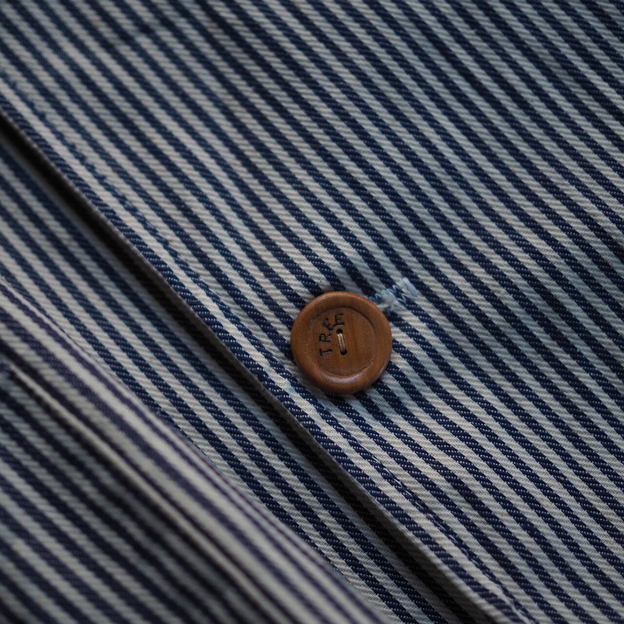 ヒッコリーストライプのような見た目でちょっと汚れても絵になるひと品で、例えばペンキがちょっとついててもかっこいい。