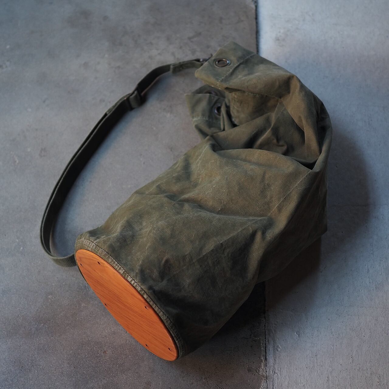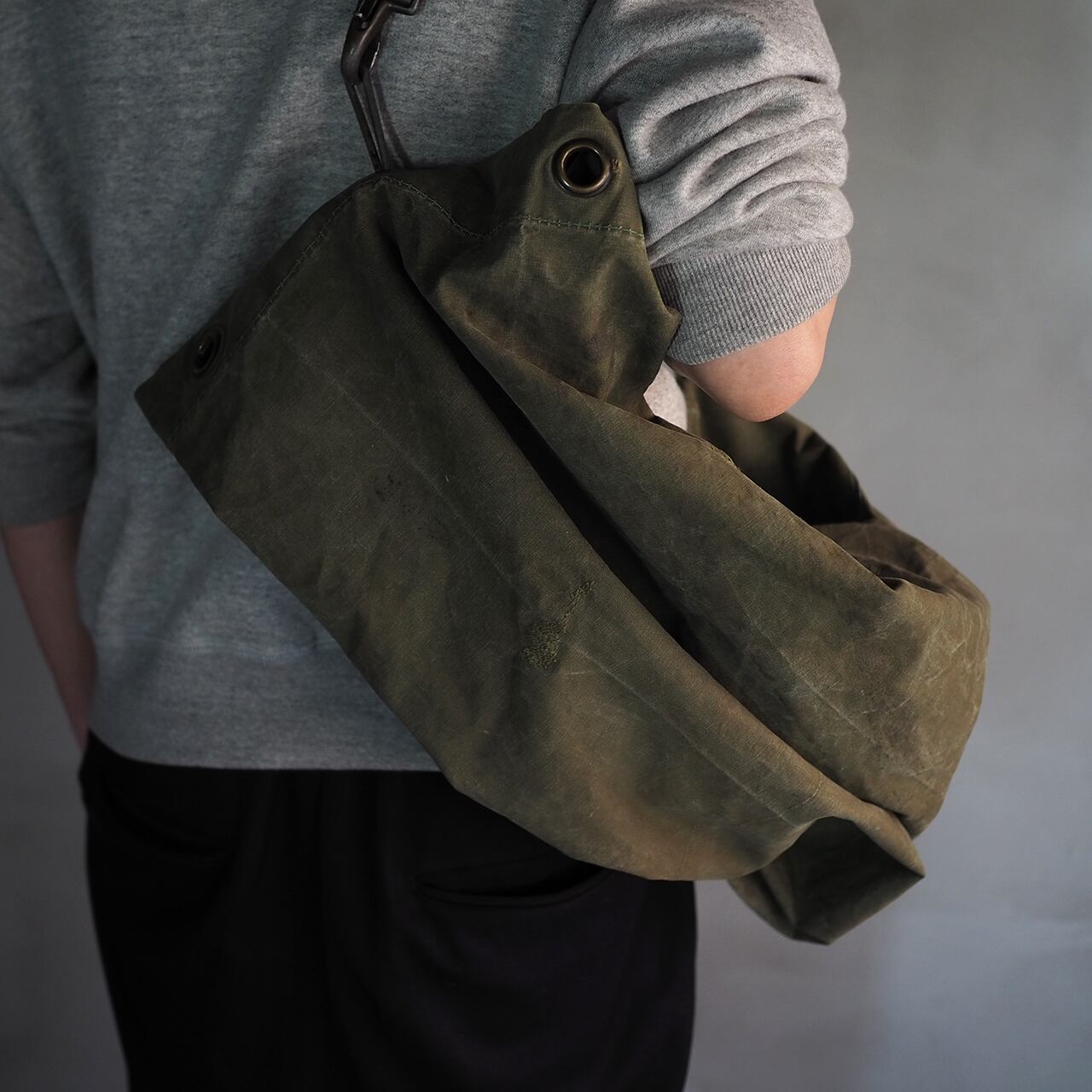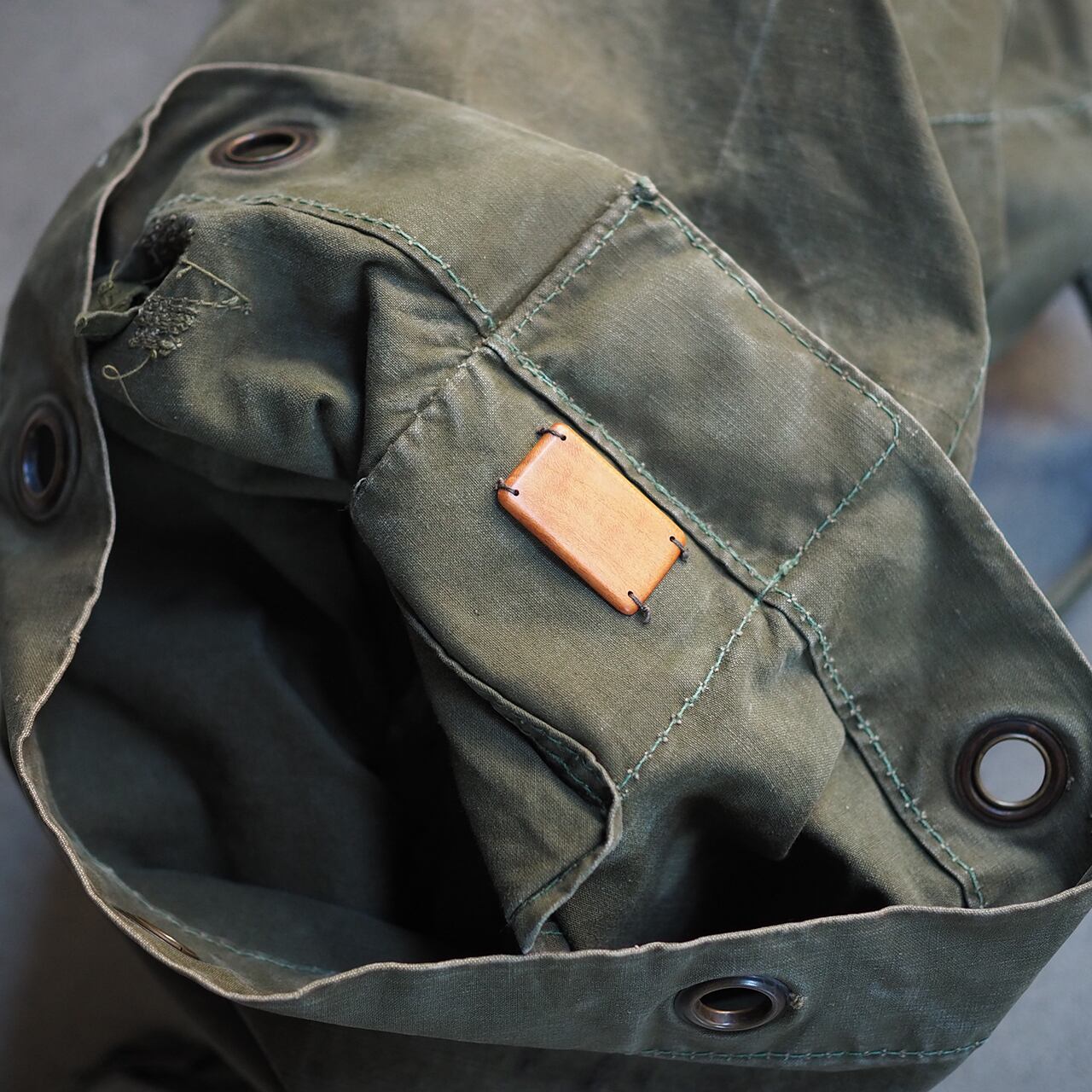 USEDのクラシックなミリタリーダッフルショルダーバッグはリペアが施されていたりサインペンで名前が書かれていたりヴィンテージの雰囲気が抜群。