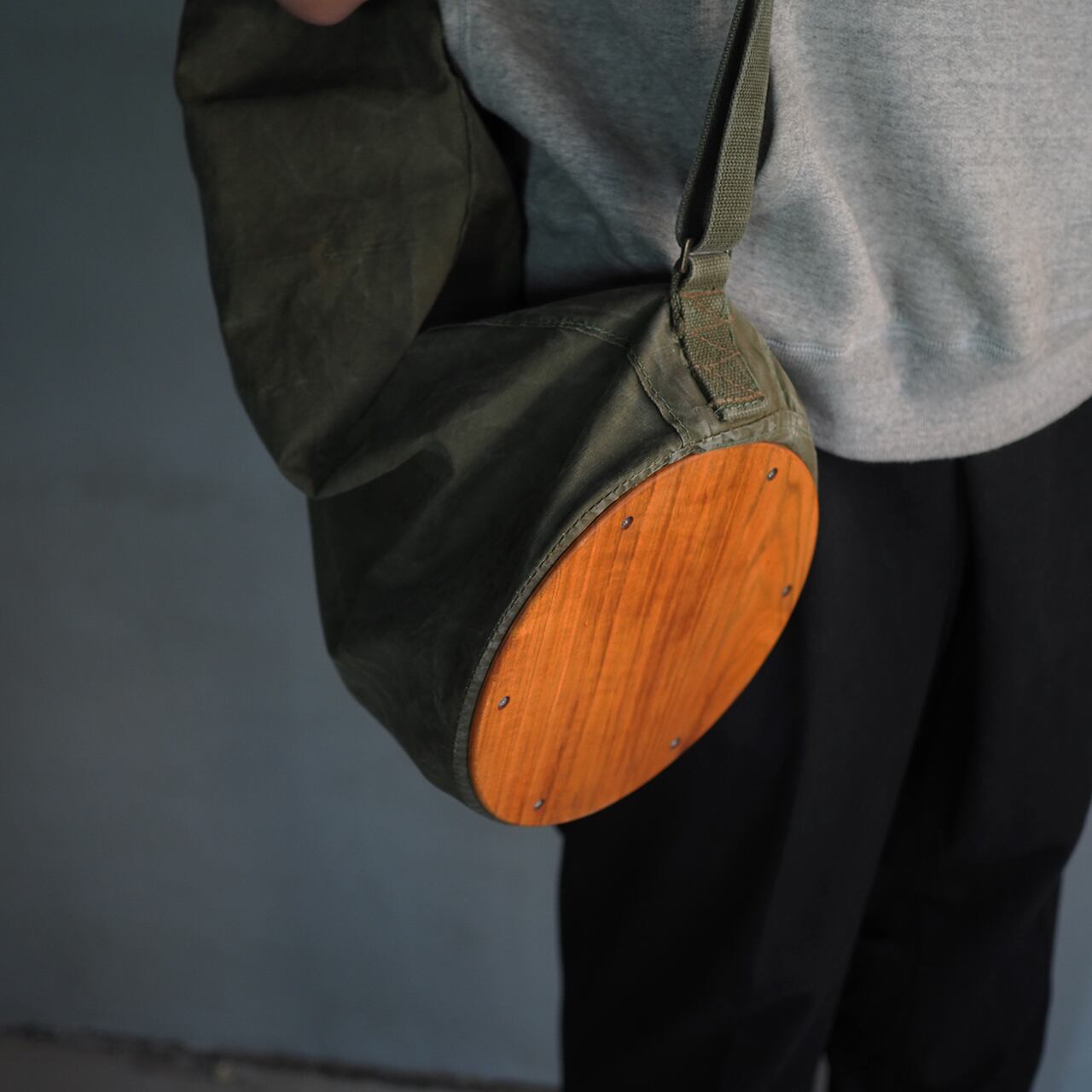「樹を纏う」をテーマに木の眼鏡を制作する63mokkoこと神田武蔵さんによるヤマザクラの木から削り出した底板をミリタリーダッフルショルダーバッグに取り付けたひと品。