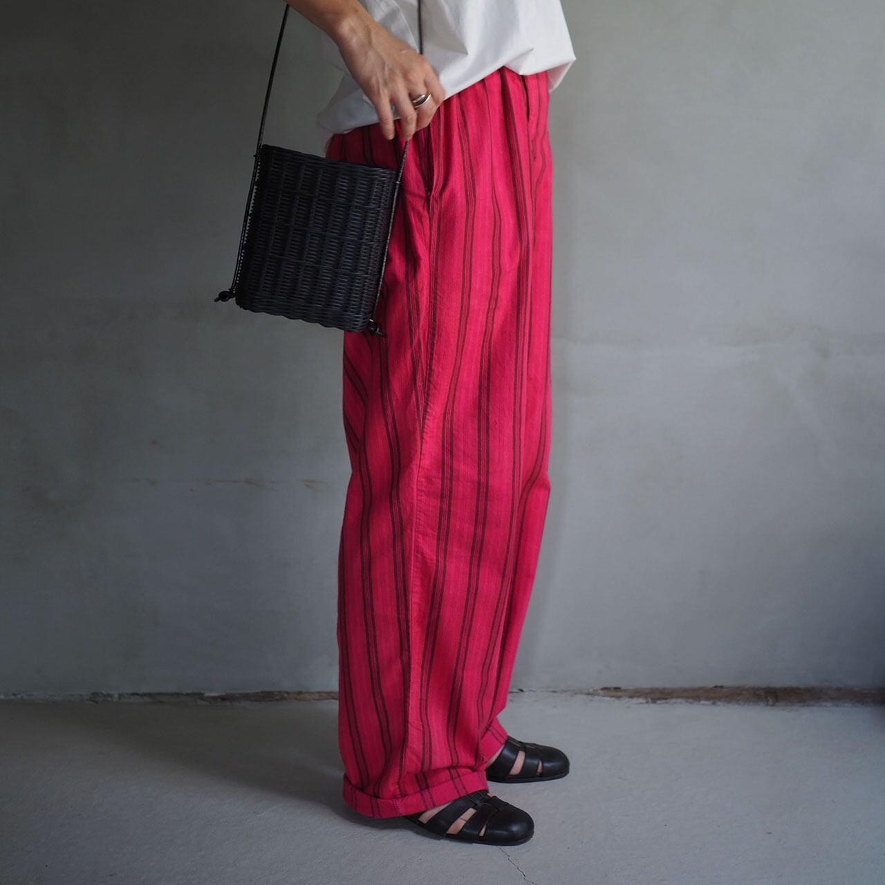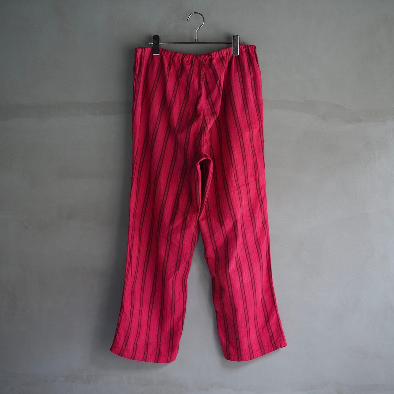 生成色がベースのストライプパンツを赤みが強いピンクで製品染めし独自の表情をつくりだしています。