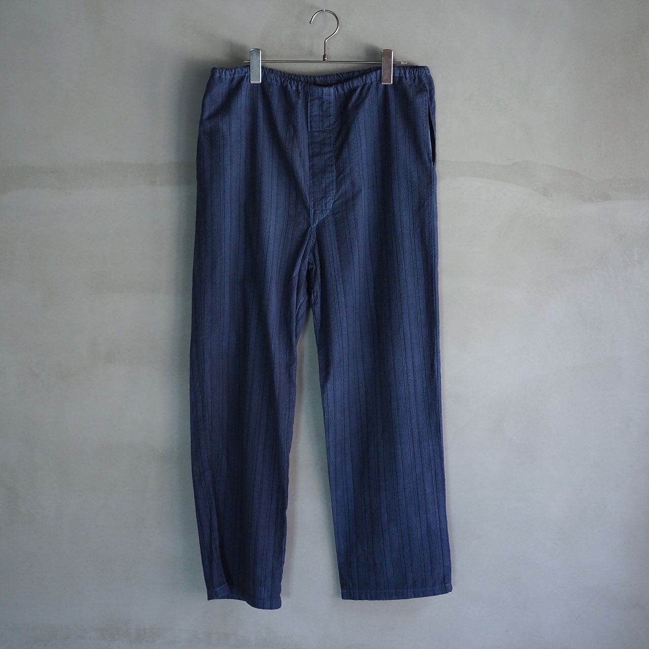 薄いグレーにブラックストライプがベースのスリーピングパンツをグレーとネイビーの混色で製品染めし独自の表情をつくりだしています。