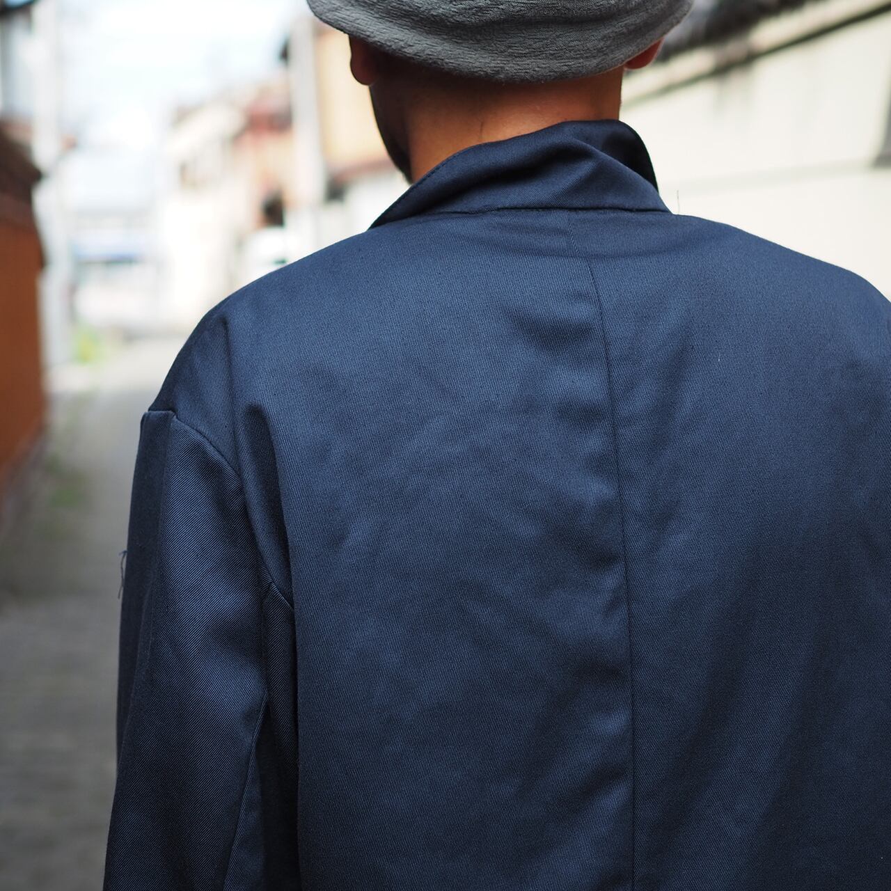 ポリエステル混紡生地の為に染まりづらく、その特性を活かして淡く染め上げる事で独自の陰影やムラ感を持ちヴィンテージの様な雰囲気を醸し出しています。