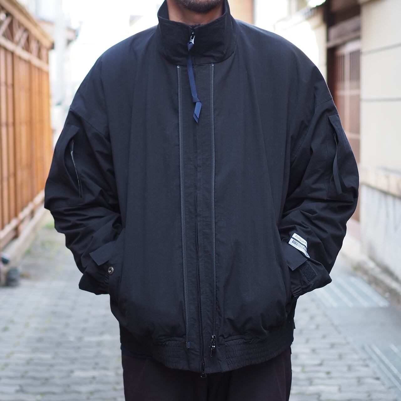 コットン/ナイロンの混紡撥水素材を使用したフライトジャケットはマットなブラックが嫌味のない高級感を放ちます。