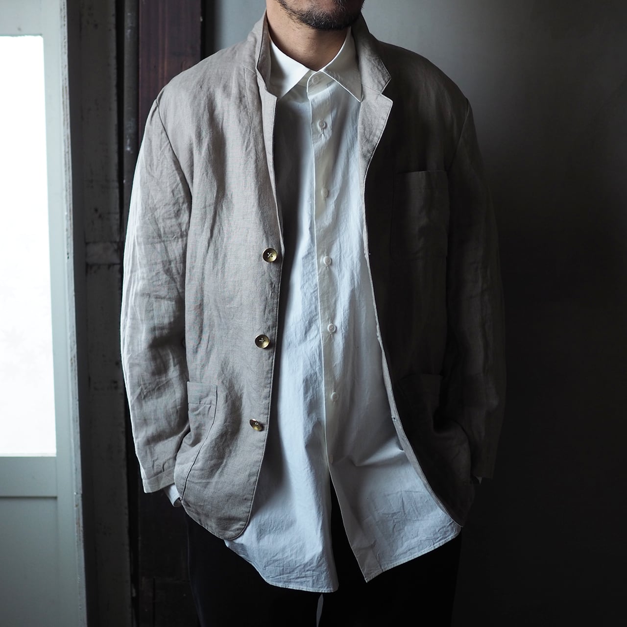 当店でセレクトしたusedのリネンジャケットと岩河さんに制作していただいたボタンとが融合した作品。