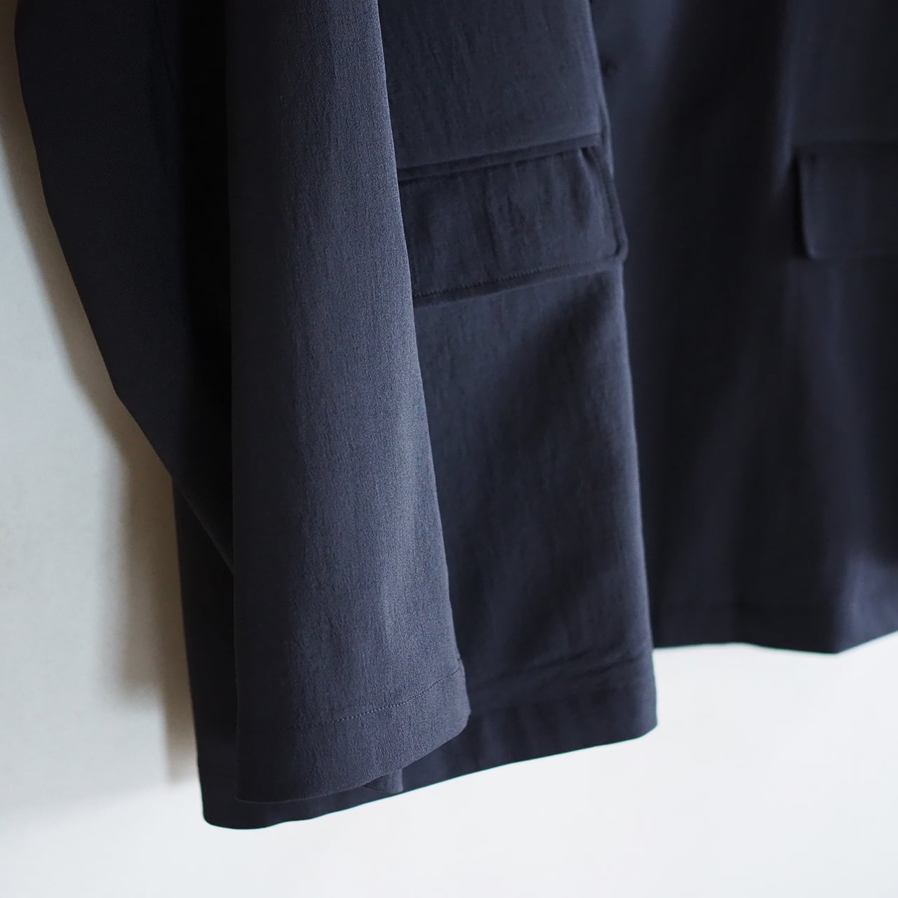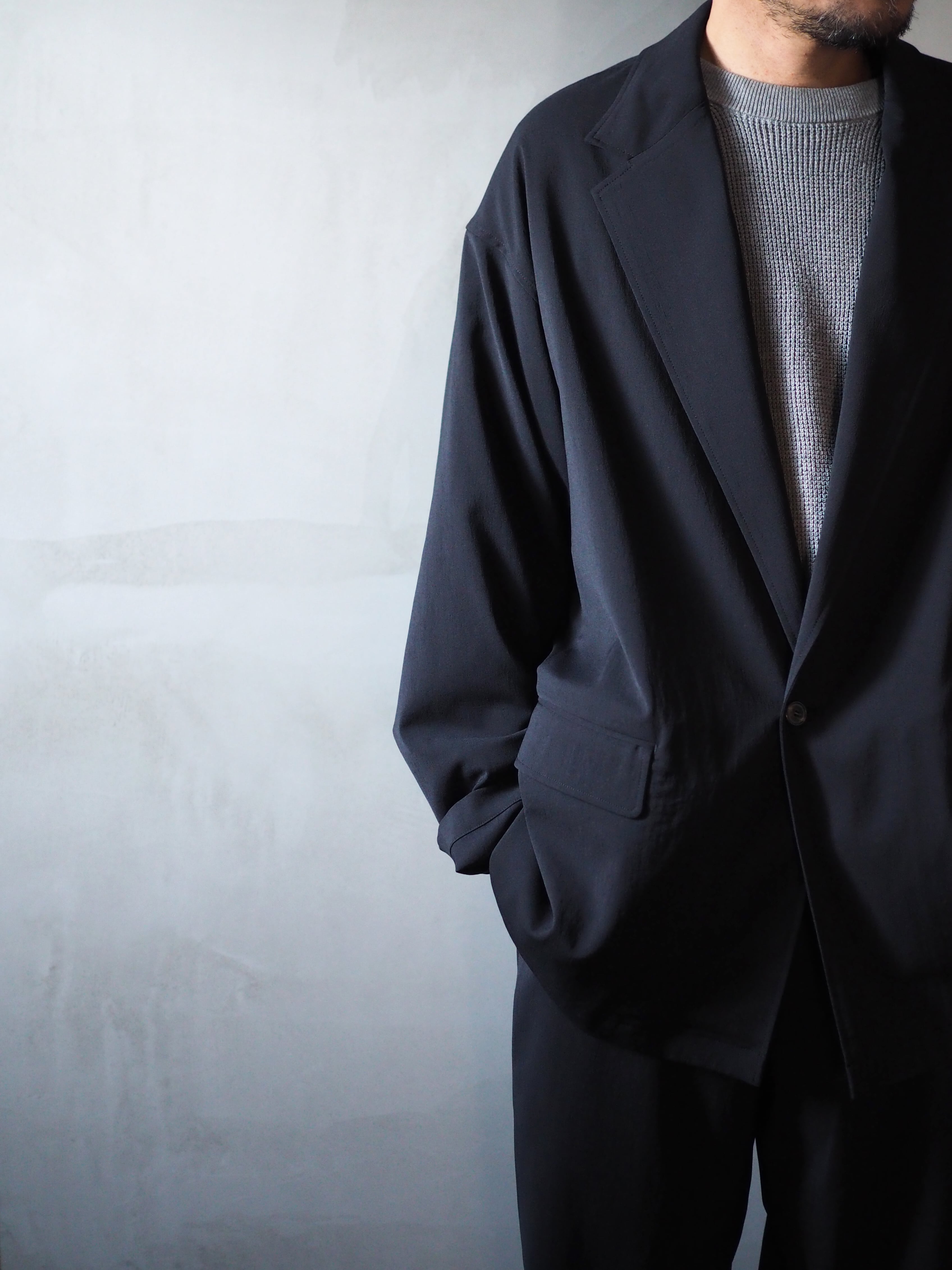 全体像としては、テーラードスタイル。羽織ってみると、生地の軽さやドロップしたショルダーライン、絶妙なボタン位置、などジャケットと言うよりは、気軽に着られるカーディガンに近いラフな羽織り心地。