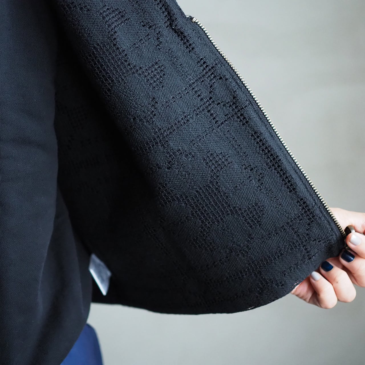 一方がキルティングでもう一方がレースファブリックのリバーシブル仕様でフロントファスナーはターンバックル仕様の本格派。