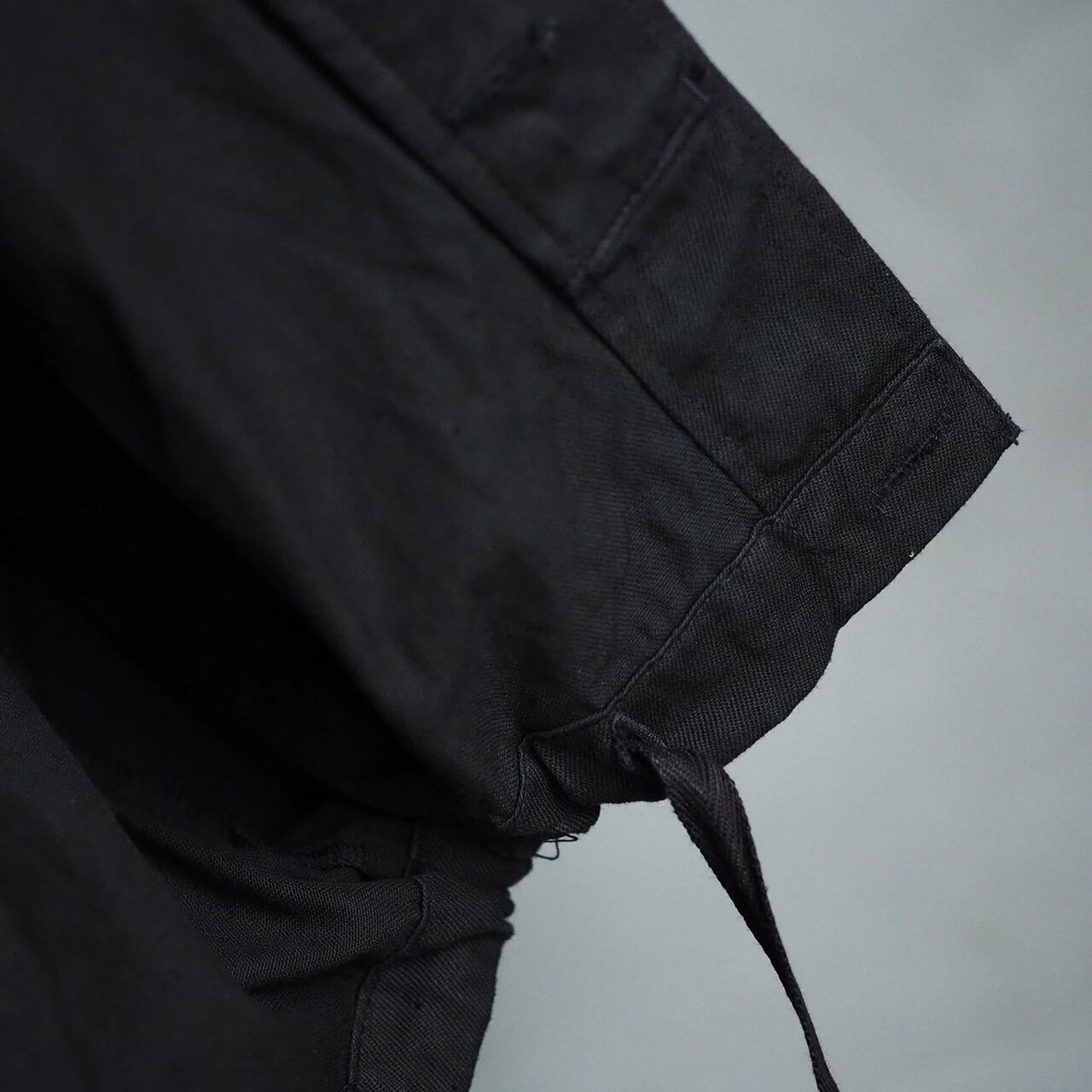 正面はフライフロント(ボタンが見えない仕立て)デザインも第一ボタンのみ見える作りで小洒落たディテール。裾にはドローコードが配置されており、絞ってシャーリングをつけることでよりデザイン性を高めることが出来ます。